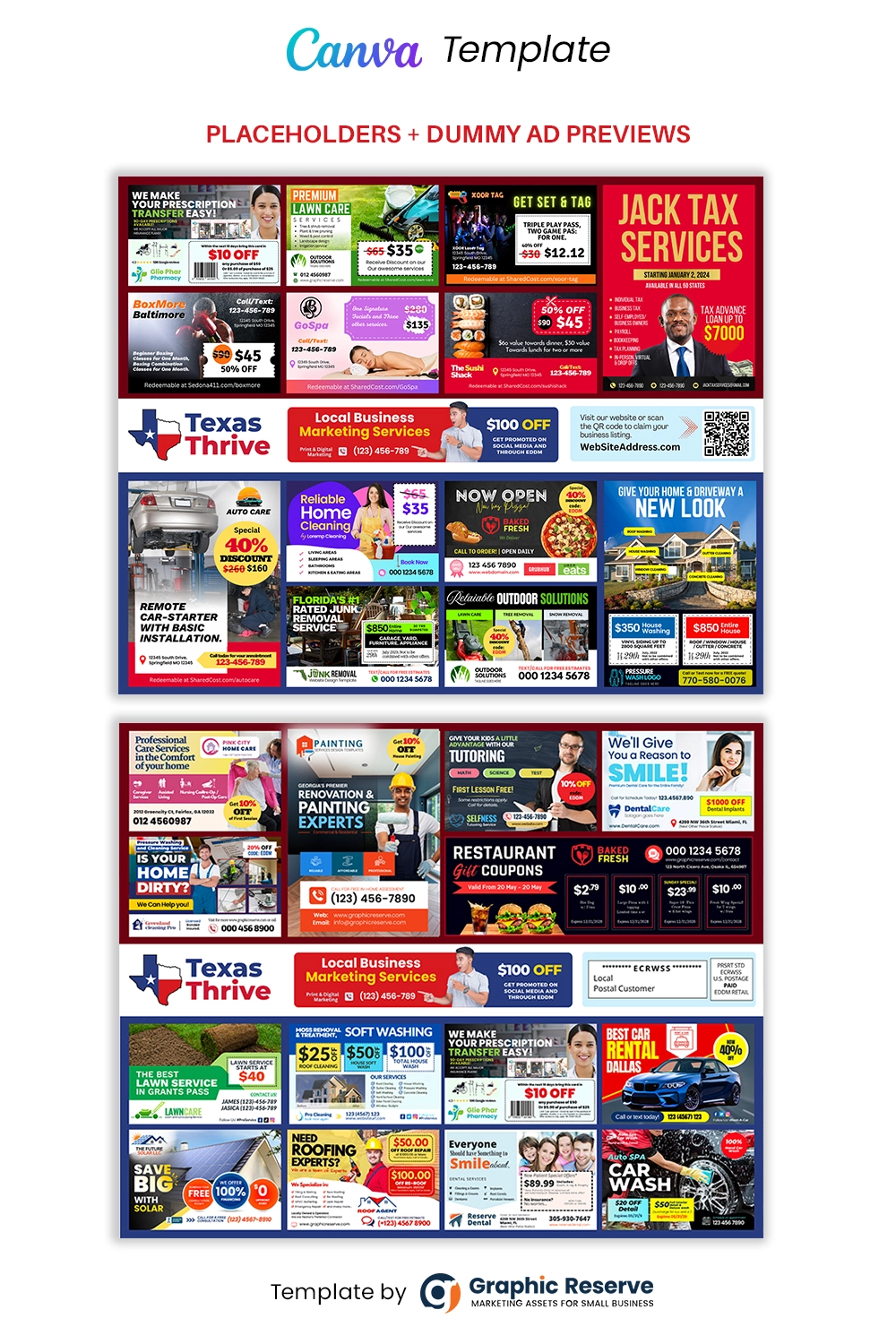 Placeholder layout, dummy ads, or fully editable ad designs (based on variant)