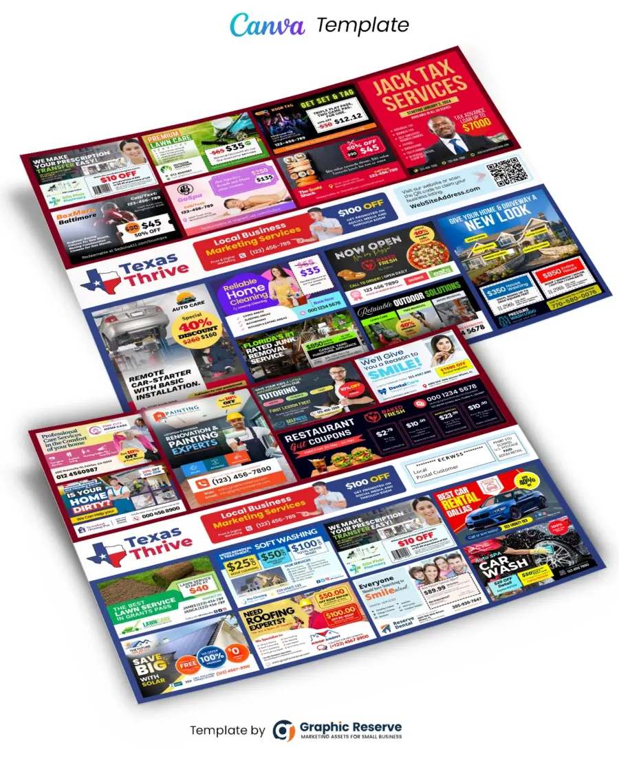 Promote multiple businesses with one powerful postcard! This 12×9 Co-Op EDDM Postcard Canva Template is designed specifically for shared-cost direct mail campaigns. Perfect for local marketing agencies, this template helps you offer premium advertising space to multiple clients on a single, oversized Every Door Direct Mail (EDDM) postcard.