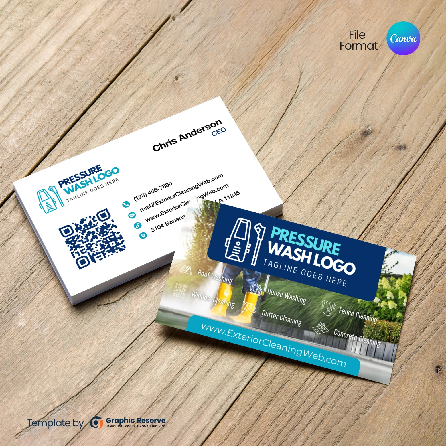 Make a lasting impression with this power washing business card template designed for pressure cleaning companies and independent contractors. Whether you specialize in exterior cleaning, roof washing, or window cleaning, this Canva design helps you create professional pressure washing business cards in minutes.
