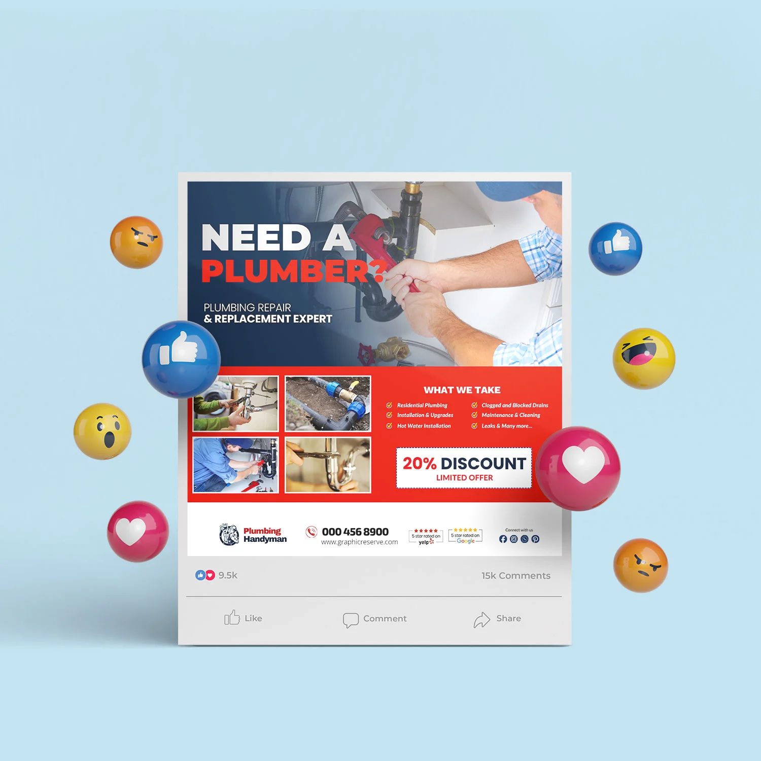 Targeted Campaigns: Includes specialized Plumbing promotional post design and optimized Plumbing Facebook post template options to boost service calls and customer engagement.