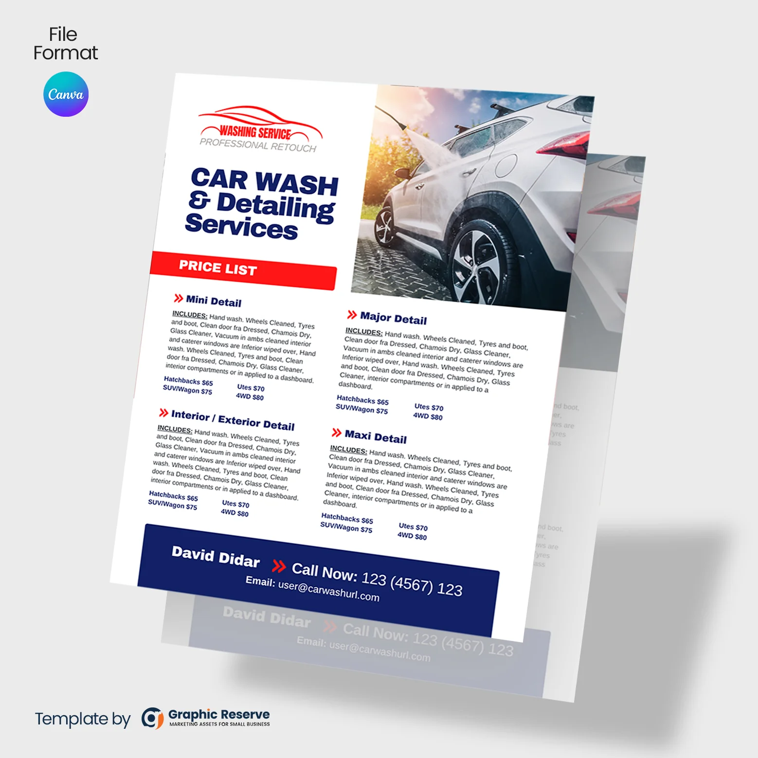 Auto Wash Flyer Design Template. Automobile’s flyer marketing template idea for car washes, garages, auto detailing services, valets, dealerships, repair shops, and other automotive businesses. Boost your company’s sales and attract new customers! all in an online easy customizable canva template
