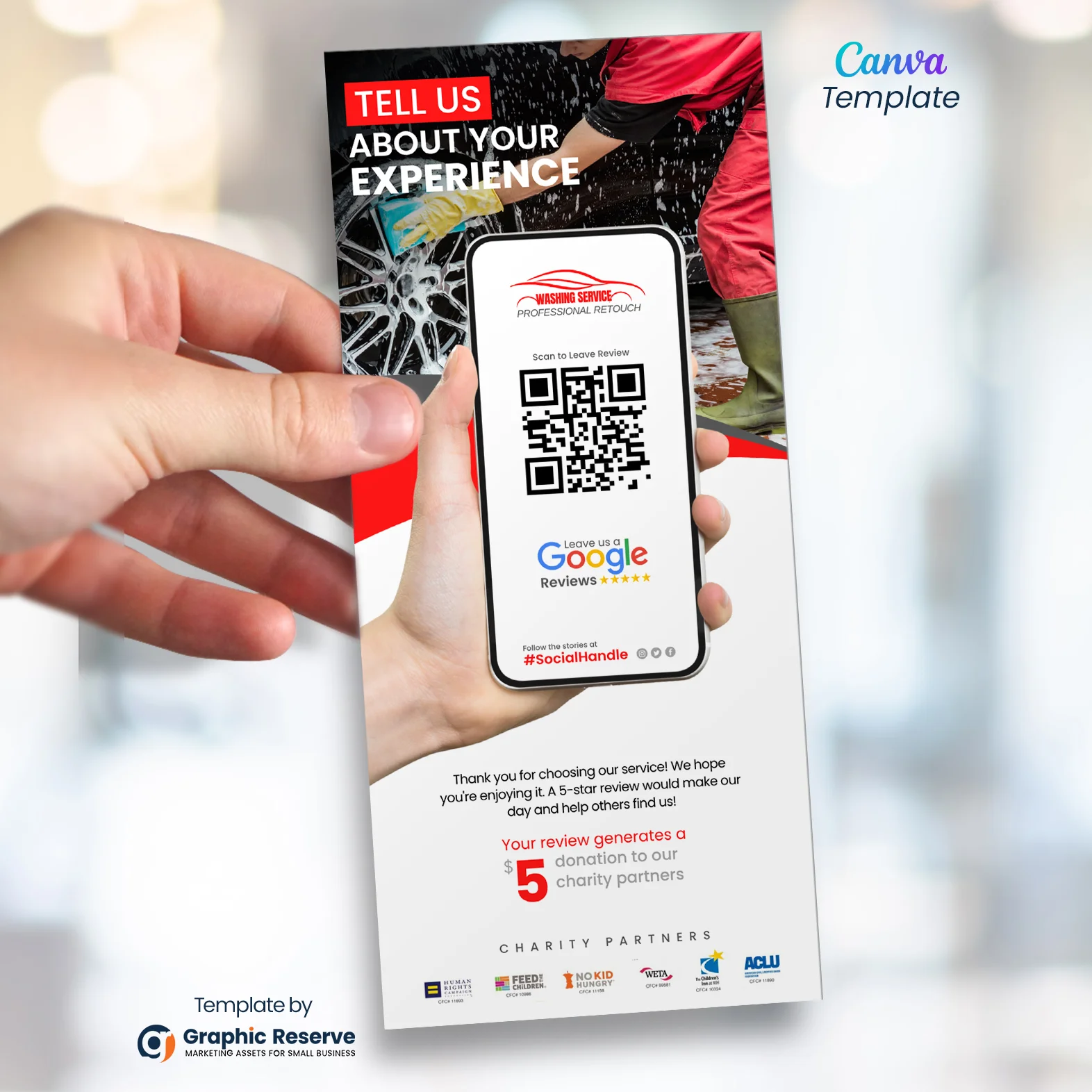 Boost your online reputation with this Car Washing Review Request Rack Card Flyer. Designed to encourage happy customers to leave reviews, this flyer is a simple and effective tool to build trust and grow your business. Fully customizable in Canva, you can easily add your branding, contact info, and a personalized message. The clean, professional layout makes it easy for customers to understand how and where to leave feedback—whether on Google, Facebook, or other platforms. Perfect for handing out at the end of a service or placing at your reception area. Just edit, print, and start collecting more positive reviews!