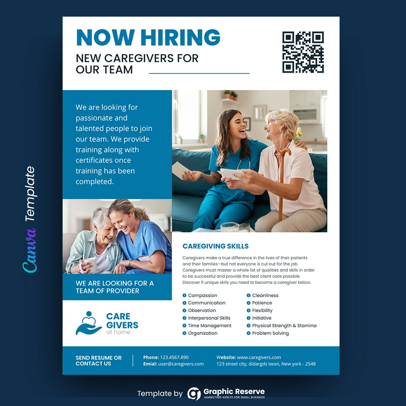 Design a professional Caregiver Home Care Flyer with our customizable Canva template. Perfect for promoting home care services, caregiver job opportunities, and the benefits of personalized care. Create eye-catching, informative flyers to attract clients and qualified caregivers to your business!