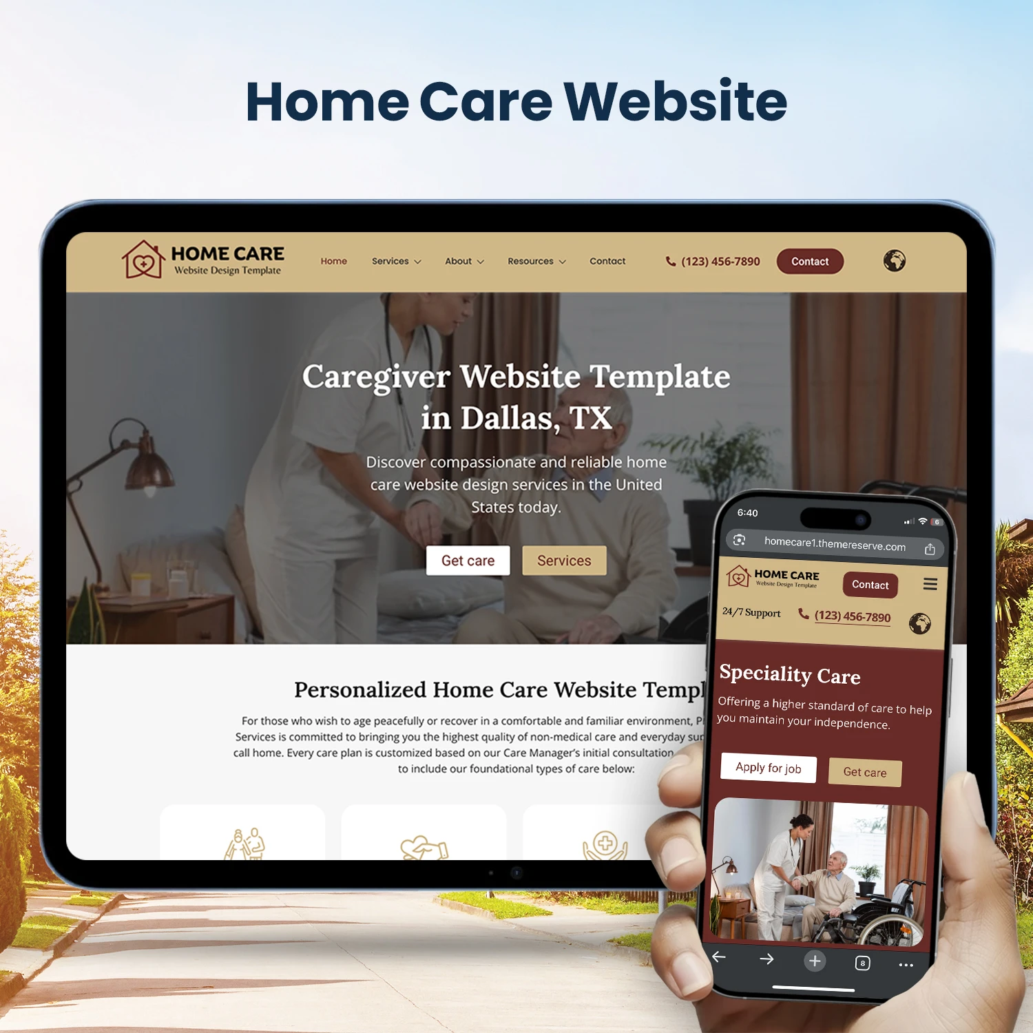 Home care website design template: SEO-friendly, online booking, and fast-loading. Its mobile-friendly design ensures it looks great on all devices for a smooth user experience.