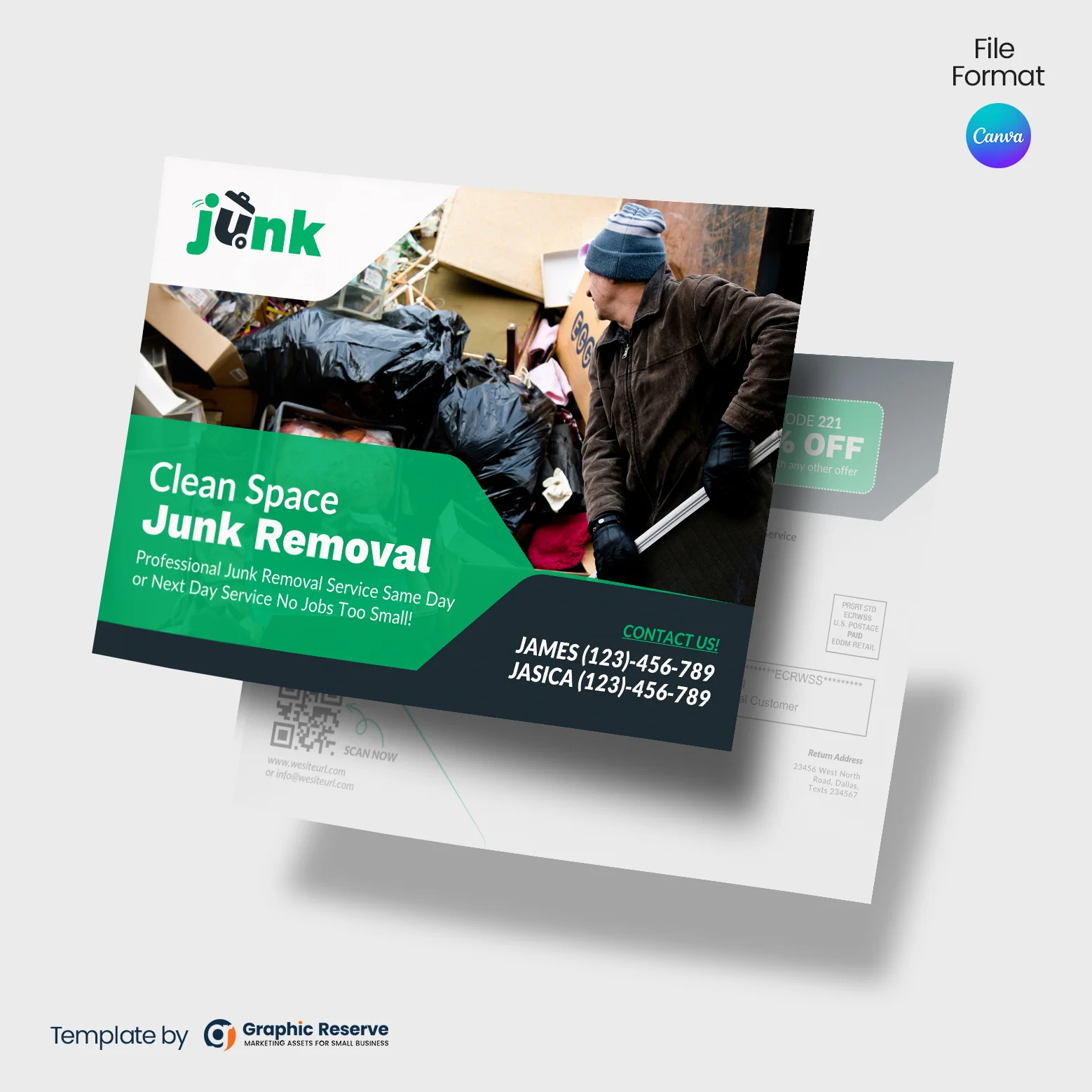 Junk Removal Canva Postcard Design This template is designed for interior and exterior junk removal and cleaning services. You can definitely use this template for any other services if you want. Fully editable, image/logo can be quickly added or replaced in Canva
