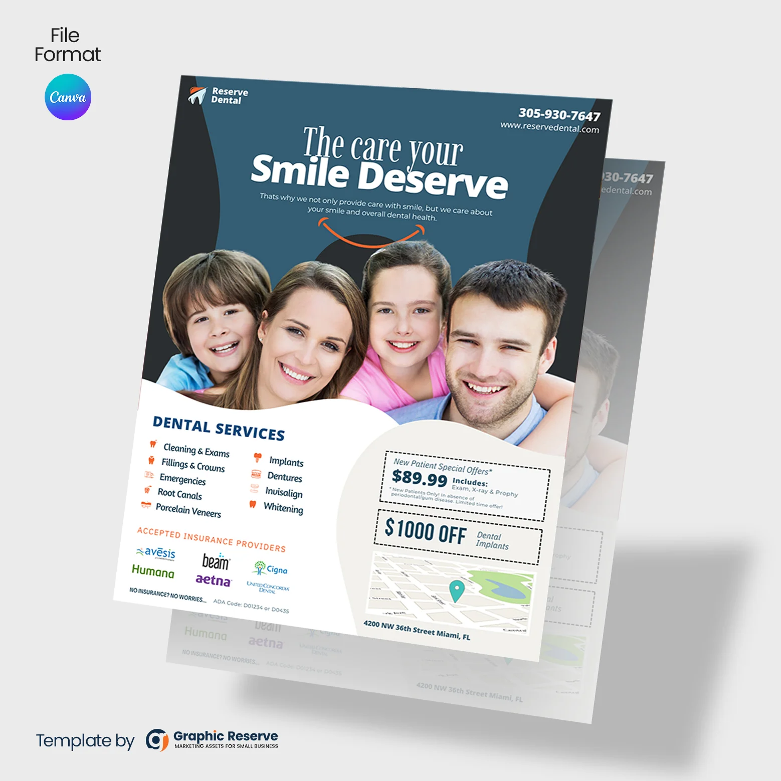 Dental Flyer Design Canva Template for easy online editing and exporting print-ready PDF. Dentist flyer with 2 coupon codes and a list of services.