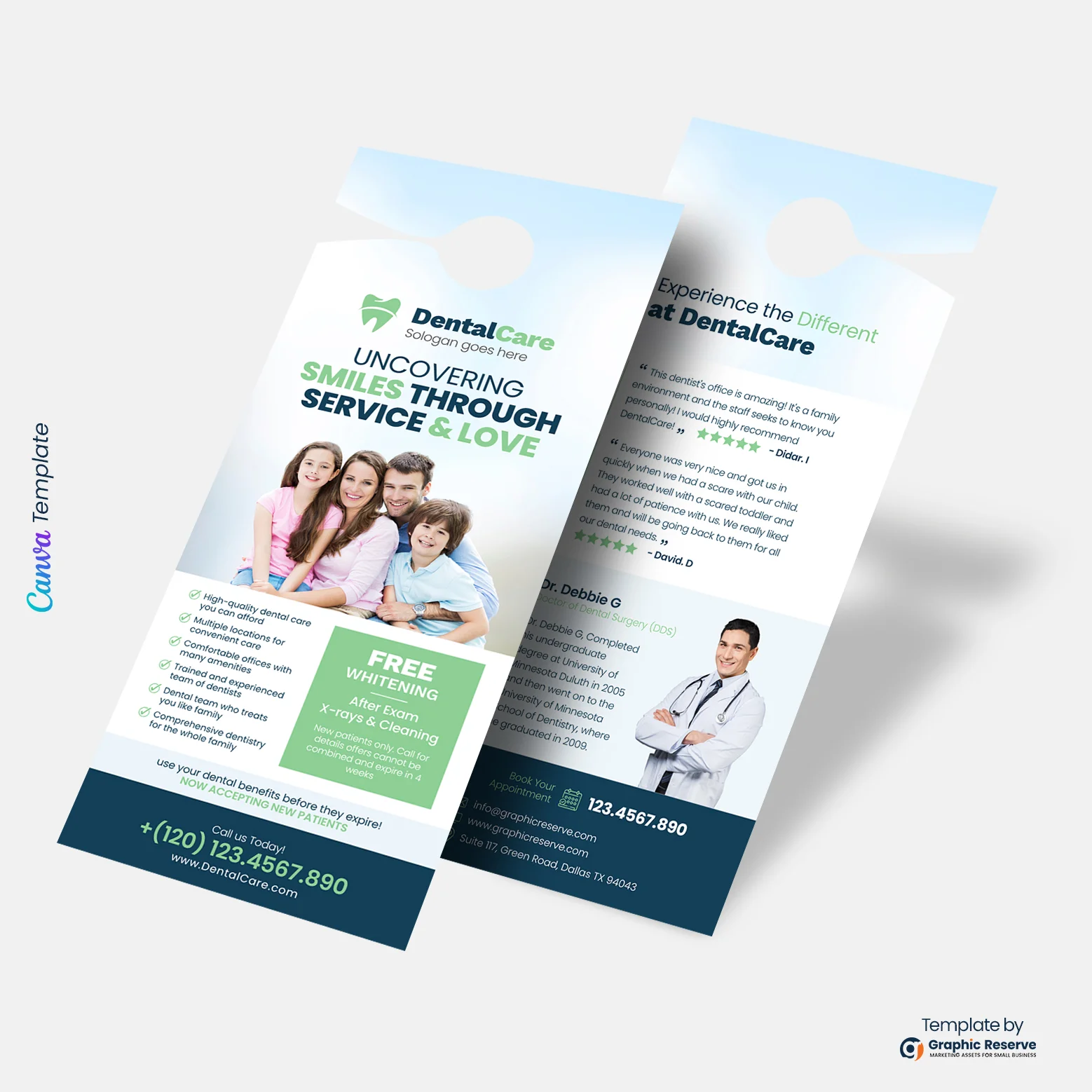 Door Hanger Template for Quality Dentistry Dental Service Door Hanger has no doubt the best marketing tool for quick success in products or services in the local area. This template can be used in any Business like medicine, doctor, health, health care, dentist, etc. Door Hanger is the absolute best tool for businesses and the business that open a new branch. Images, texts, and colors are fully editable, You can edit them quickly and easily in Canva.
