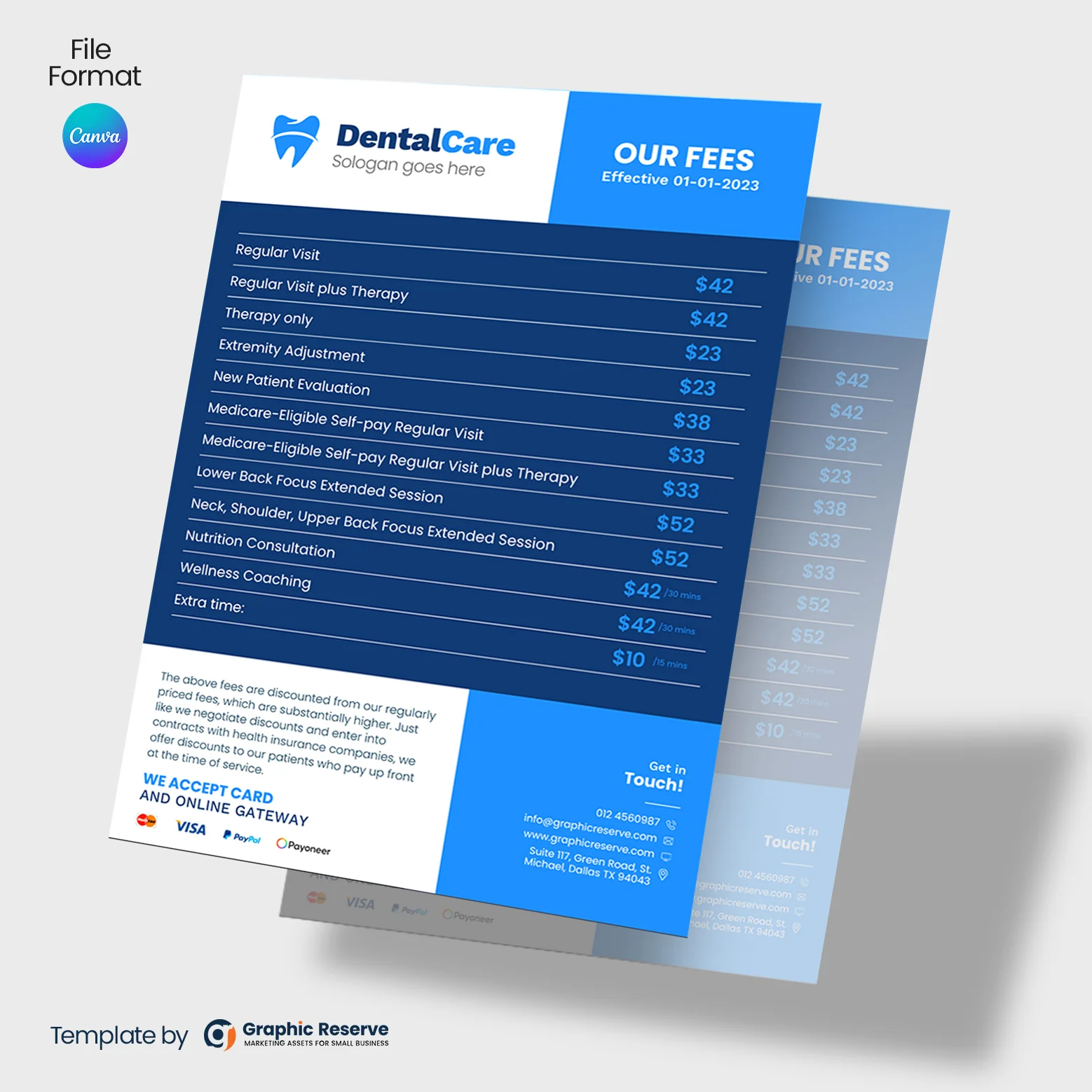 Flyer Design Template for Quality Dentistry Dental Service Flyer Design has no doubt the best marketing tool for quick success in products or services in the local area. This template can be used in any Business like medicine, doctor, health, health care, dentist, etc. Flyer Design is the absolute best tool for businesses and the business that open a new branch. Images, texts, and colors are fully editable, You can edit them quickly and easily in Canva.