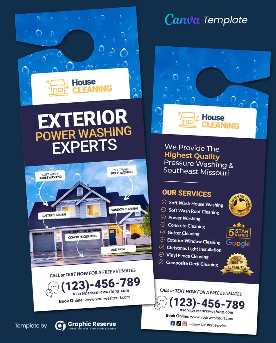 Exterior Cleaning Canva Door Hanger This template is designed for interior and exterior washing and cleaning services. You can definitely use these canva door hangers for any other services if you want. Fully editable, image/logo can be quickly added or replaced in Canva