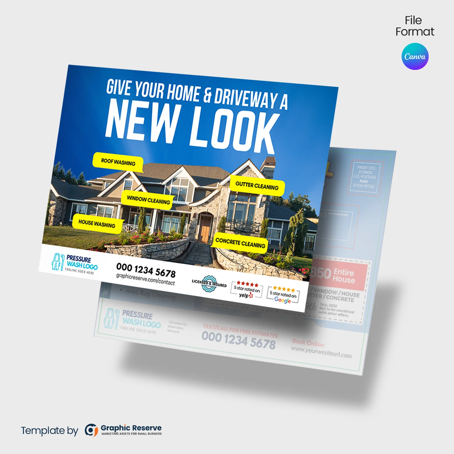 Exterior cleaning eddm postcard template for cleaning business door-to-door advertising. Every door direct mail EDDM postcard template for exterior cleaning businesses like pressure wash, soft wash, window cleaning, roof cleaning, gutter cleaning, deck cleaning, roof cleaning, etc.