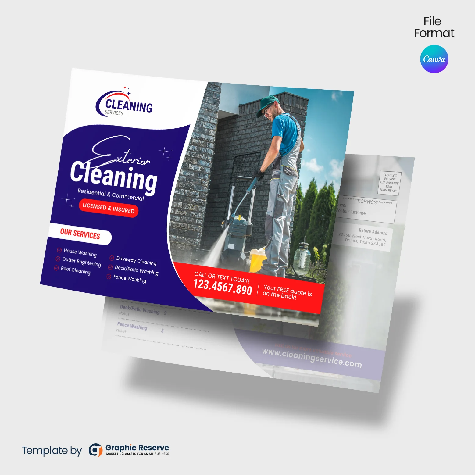 Exterior Cleaning Service EDDM Mailer Postcard Canva template This postcard template is specially designed for Cleaning and Washing Services, You can definitely use this template for any other Services if you want. Fully editable, image/logo can be quickly added or replaced in Canva