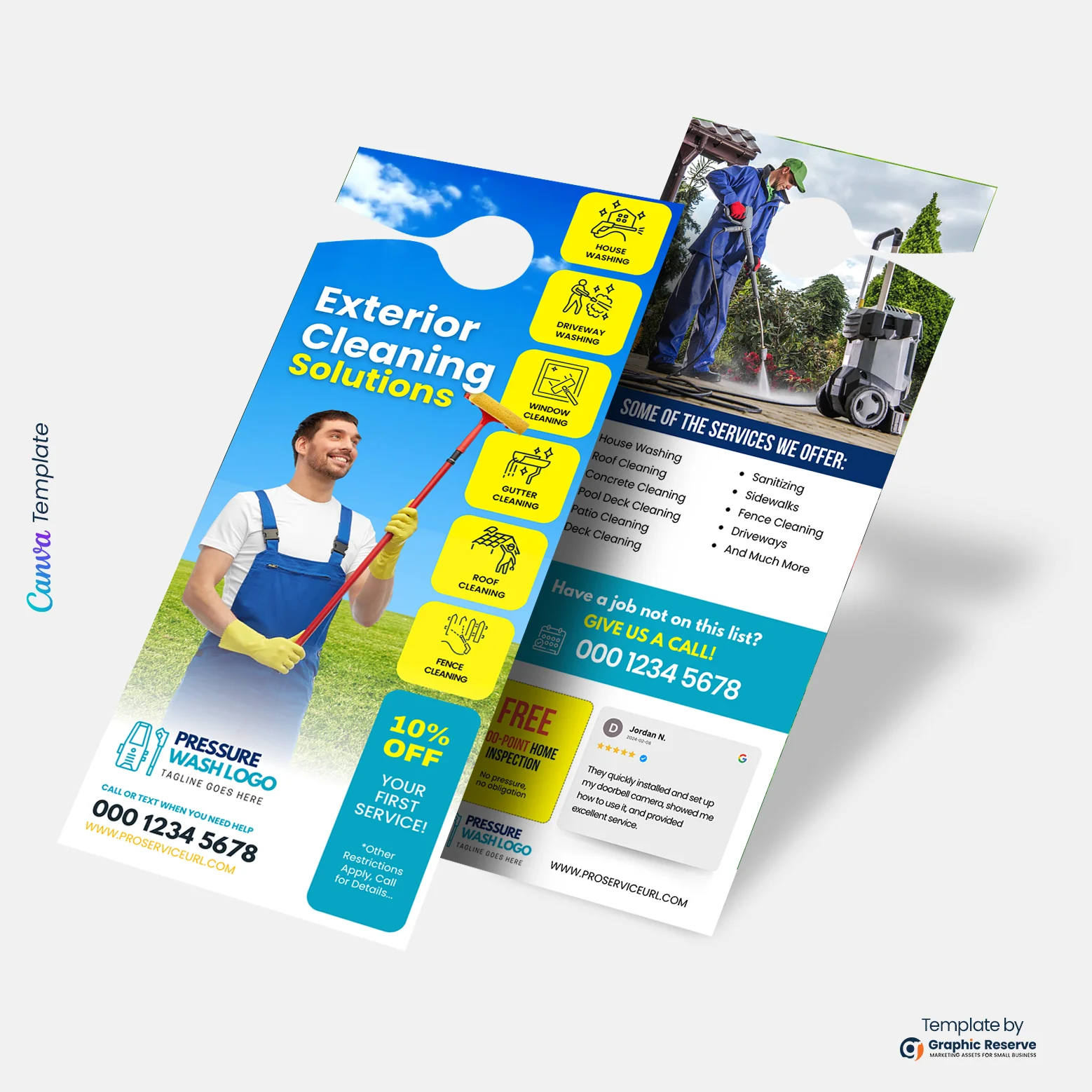 Boost your local visibility with this easy-to-edit power washing door hanger template made for pressure washing companies of all sizes. This Canva design is perfect for promoting services such as driveway cleaning, house washing, fence restoration, and more. Create stunning door hangers pressure washing campaigns by adding your own text, colors, and high-quality photos. Designed with clean layouts and strong call-to-action sections, this template helps capture attention and drive customer engagement. Whether you’re a startup or an established cleaning business, these pressure washing door hanger templates make it simple to create professional marketing materials without expensive designers. Just customize, print, and distribute to target neighborhoods where homeowners need your services. A well-placed door hanger is a cost-effective way to advertise special offers, seasonal deals, and routine maintenance packages for your power washing advertising campaigns.