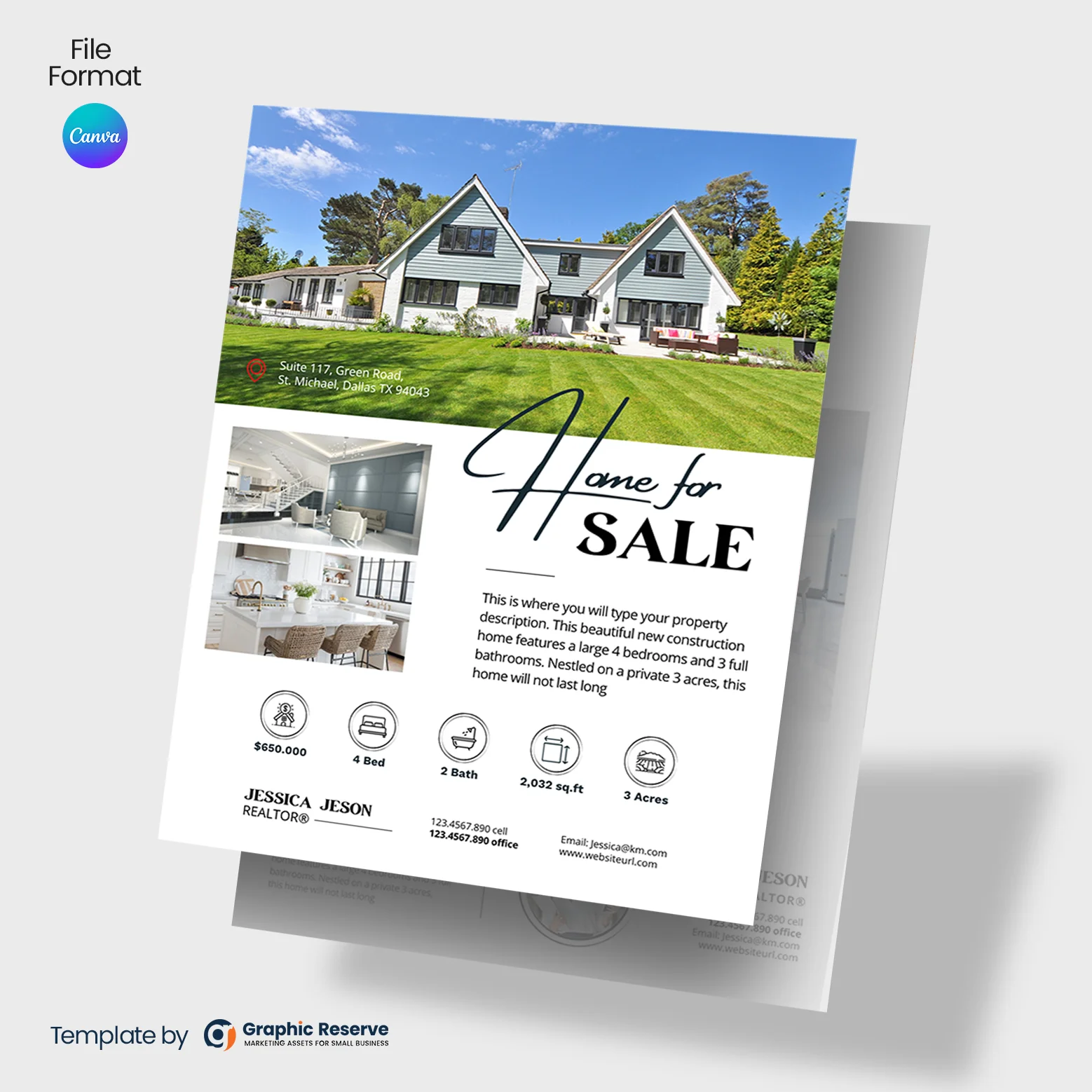 Showcase listings in style with this Home for Sale Flyer Template. Fully customizable in Canva—ideal for real estate agents to market properties and attract buyers.