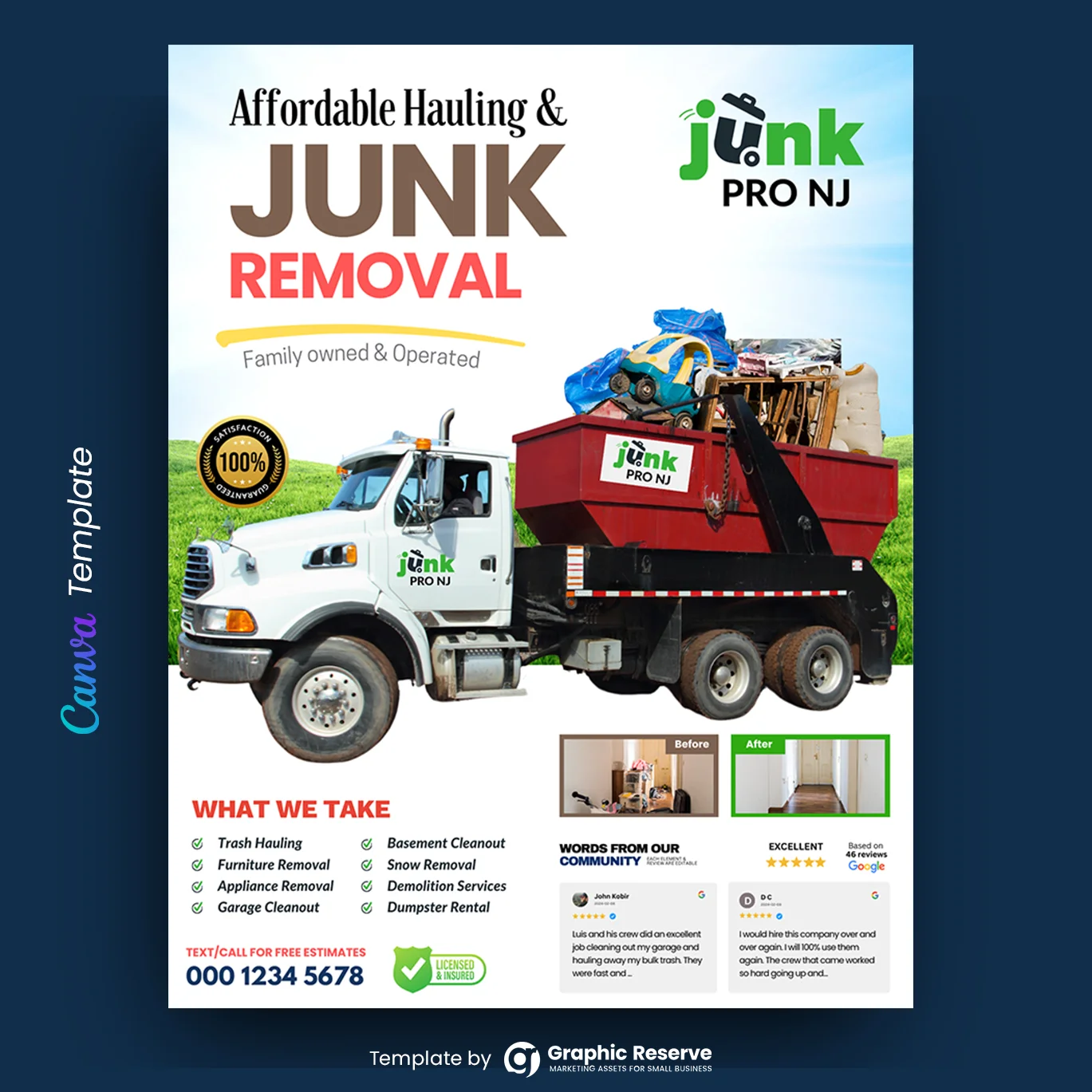 • 🚛 Professional Layout: Features a bold, modern design with service highlights, customer testimonials, and a special offer section
