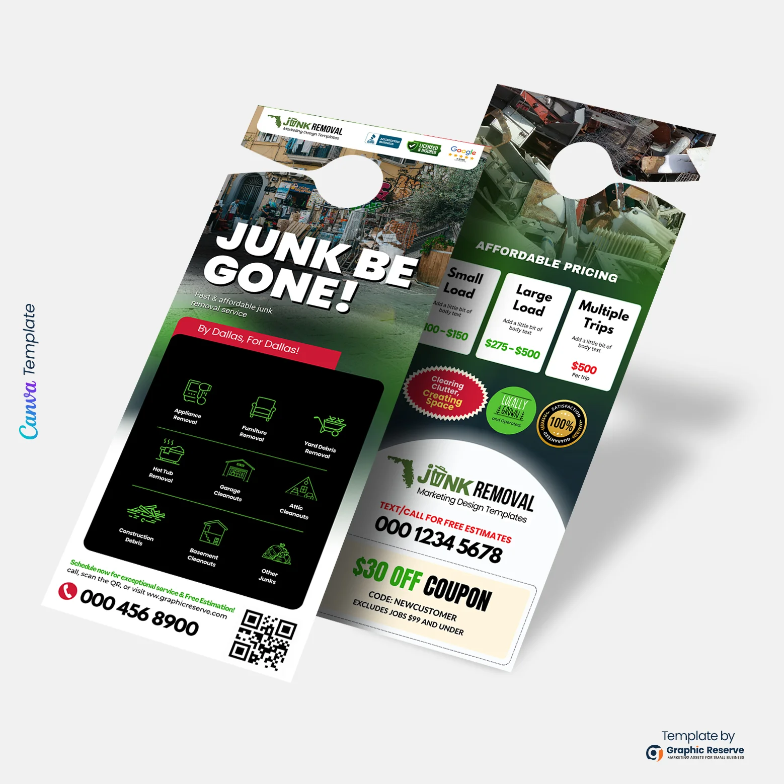 Promote your junk removal business with Canva door hanger templates. Easy-to-edit, print-ready designs for effective local junk removal advertising.