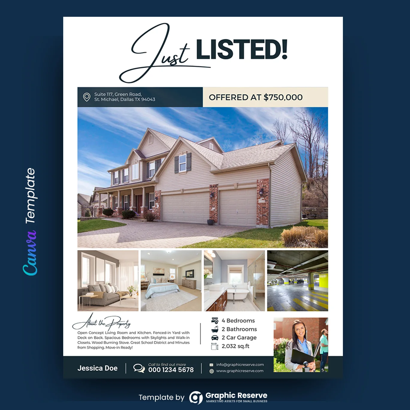 Real Estate Just Listed Flyer template is a great tool for promoting your real estate business also useful for a realtor or a real estate agent. You can use it for real estate listings, advertising homes or property for sale, or renting houses. Create a stunning leaflet on the fly and streamline your workflow with this easy to edit the template. Fully editable, image/logo can be quickly added or replaced in Canva