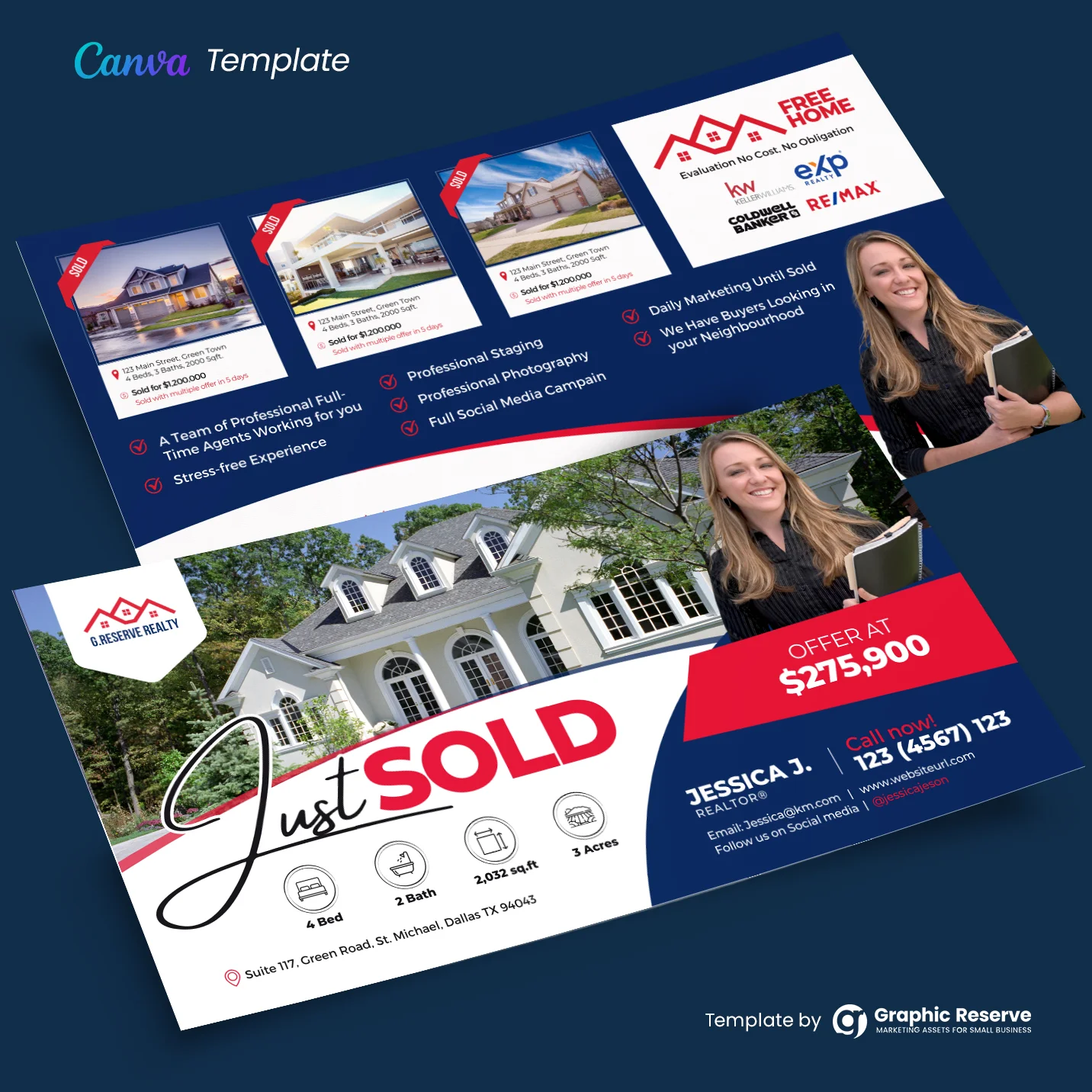 The real estate eddm mailer postcard template is an excellent tool for promoting your business and is also useful for a realtor or real estate agent. You can use this eddm template for real estate listings or sold, advertising homes or property for sale, or renting houses. Create a stunning leaflet on the fly and streamline your workflow with this easy-to-edit template. Fully editable, image/logo can be quickly added or replaced in Canva