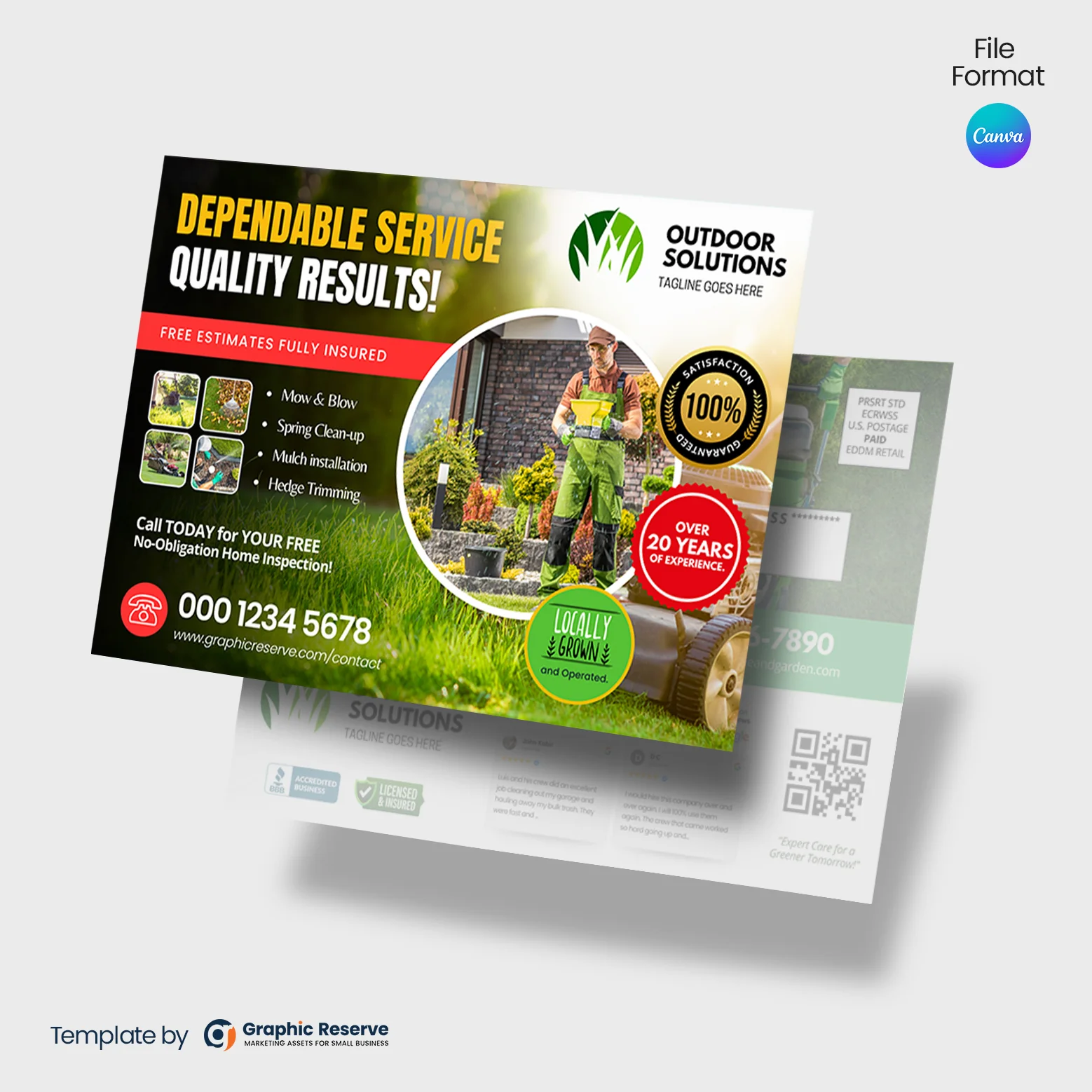 Promote your lawn care services with this Canva EDDM postcard template. Fully customizable, 9×6.5 VistaPrint size, and perfect for direct mail marketing.