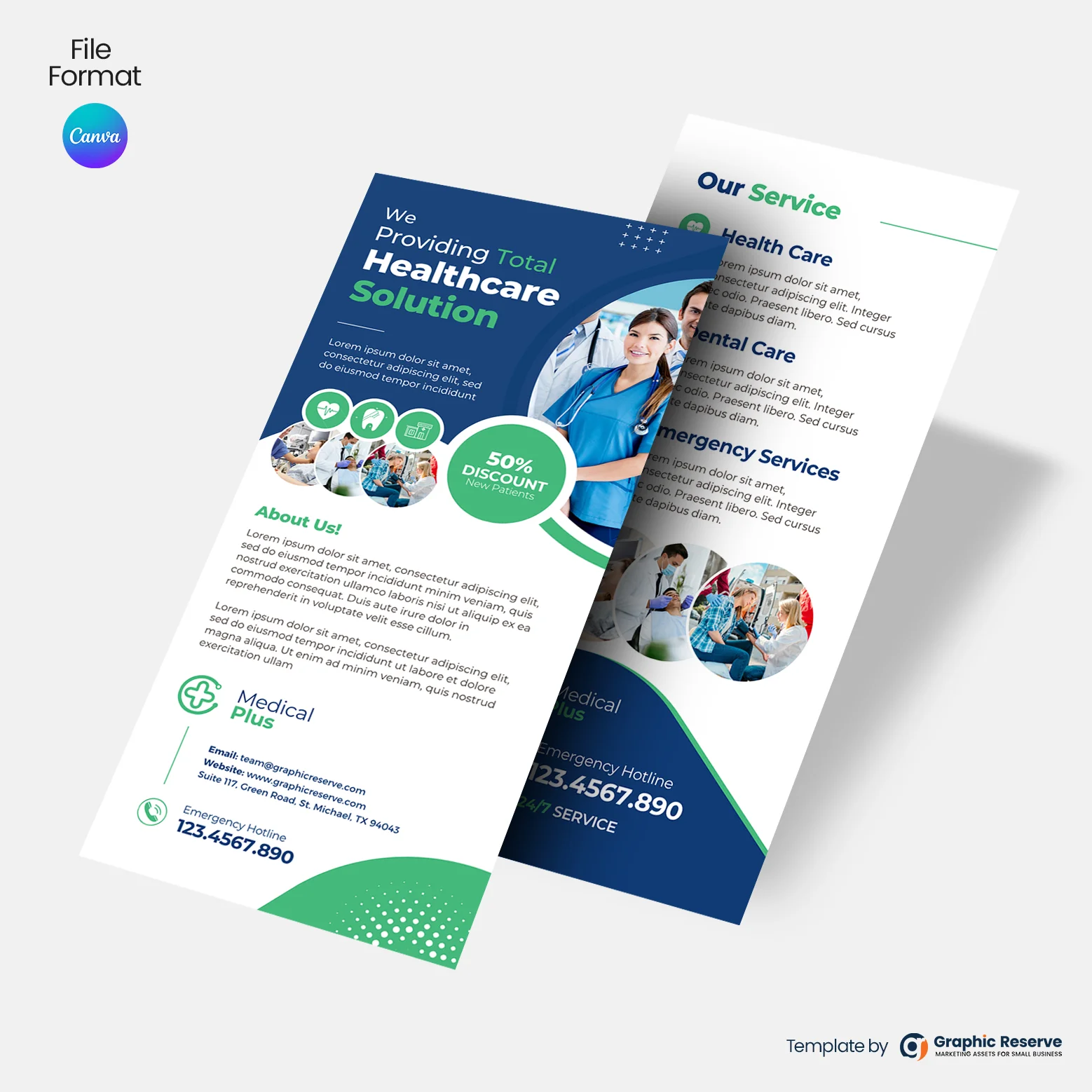 Medical DL Flyer Design Canva Template for easy online editing and exporting print-ready PDF. Hospital clinic diagnostic marketing flyer with a list of services. Clean and modern design with a hospital photo on the design included.