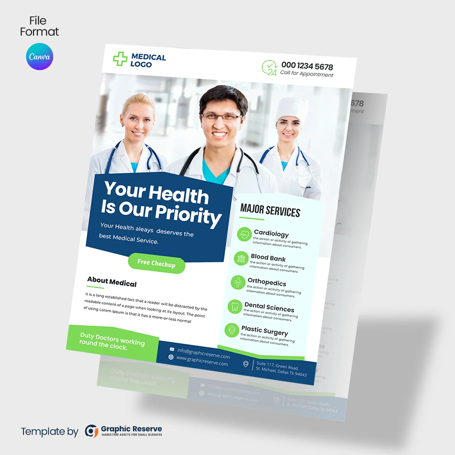 Medical Flyer Canva Design Template for easy online editing and exporting print-ready PDF. Hospital clinic diagnostic marketing flyer with list of services.