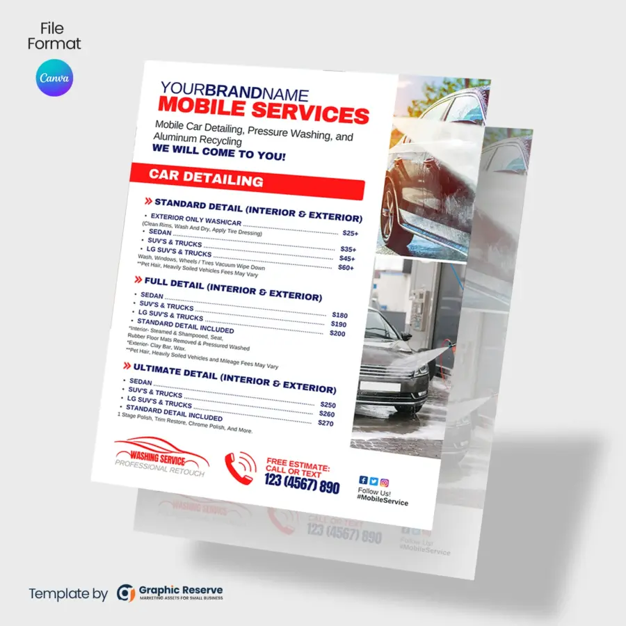 Automobile’s flyer marketing template idea for car washes, garages, auto detailing services, valets, dealerships, repair shops, and other automotive businesses. Boost your company’s sales and attract new customers! all in an online easy customizable canva template