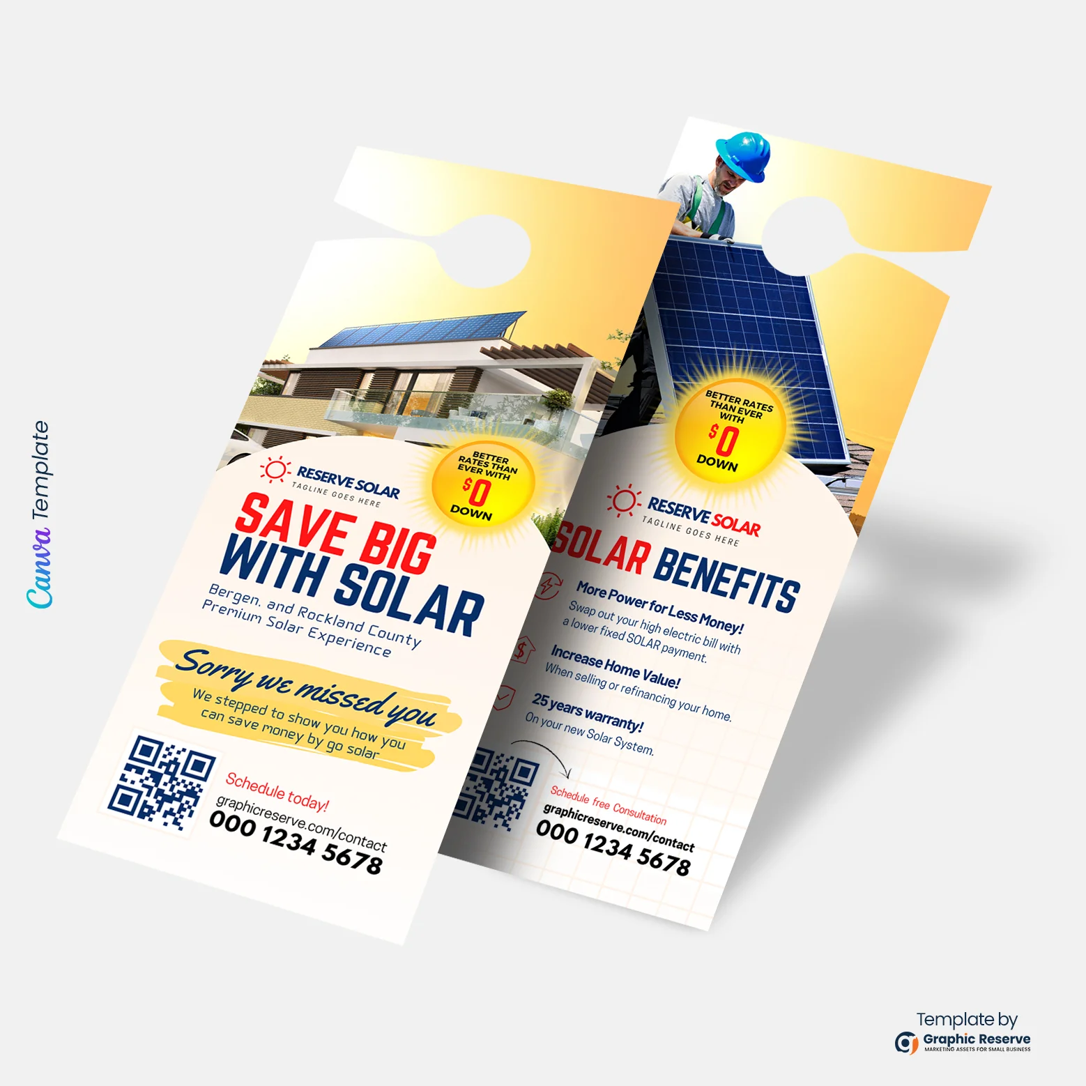 Solar door hanger design template canva for solar business marketing. Solar panel and installation service marketing door hanger advertising canva template.