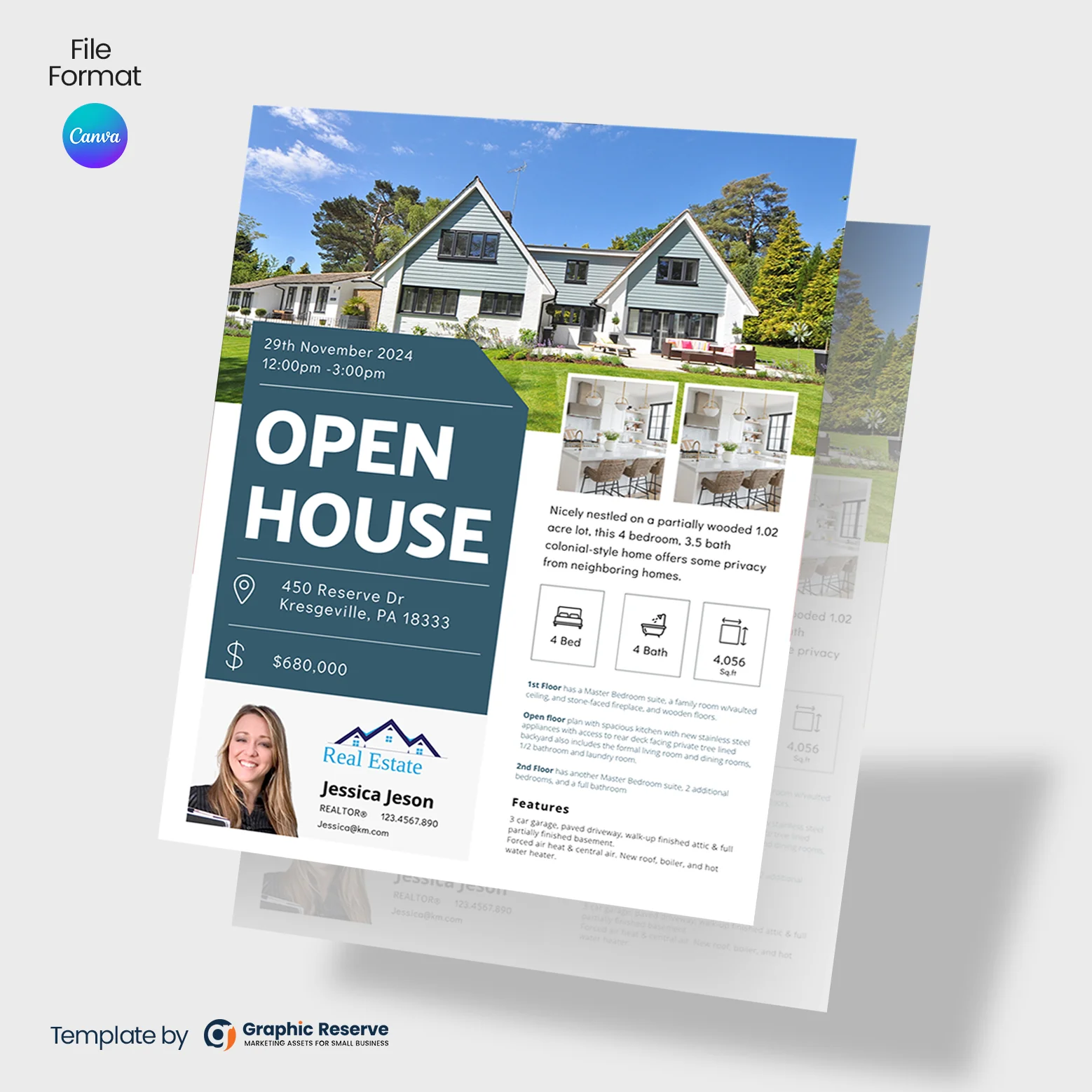 Create eye-catching Open House flyers with this editable Canva template — ideal for real estate agents to showcase listings and attract potential buyers.