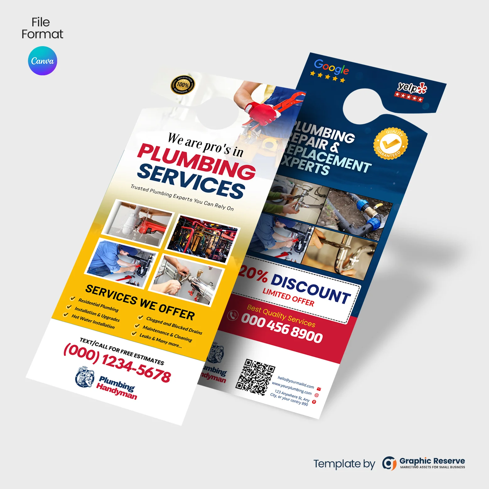 The template is fully optimized for the Canva Plumbing Door Hanger Design platform, allowing for effortless customization. It acts as your Custom Plumbing Door Hanger Canva tool, giving you complete control over your brand identity without needing a designer.