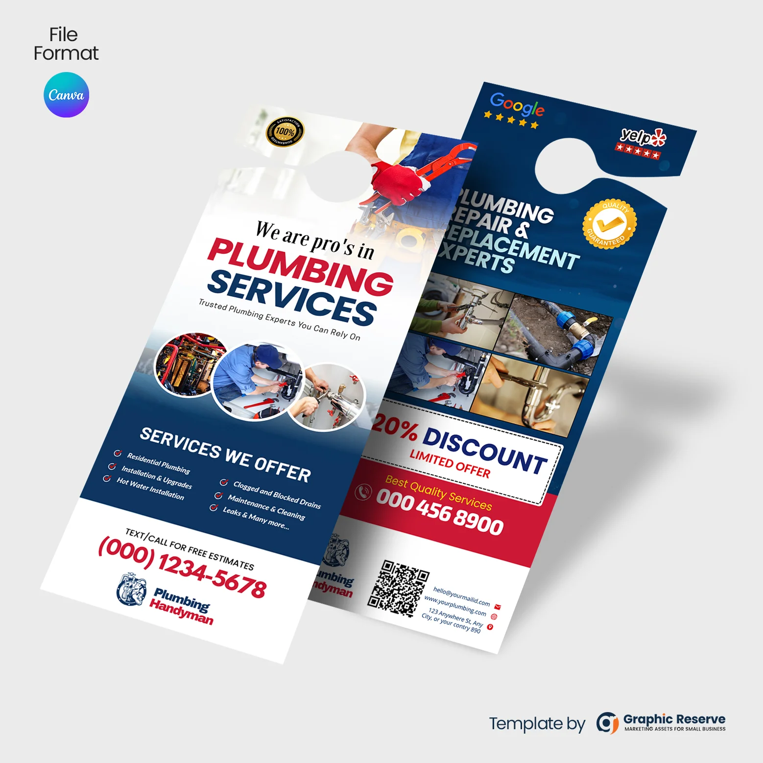 Grow your marketing with this professional Plumber Advertising Door Hanger template. This is the top-tier Plumbing Business Marketing Template designed for quality and high conversions. Fully integrated with the Canva Plumbing Door Hanger Design platform, it offers seamless editing, functioning as your Custom Plumbing Door Hanger Canva tool.