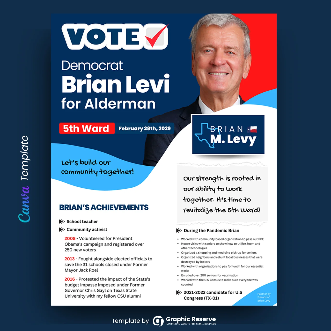 Reach voters with impact using this political campaign flyer template for Canva. Perfect for election flyers, political party flyers, and campaign events, this template allows you to customize every detail with ease. Highlight your platform, candidate photo, and key issues to inspire voter confidence. Whether you need election campaign flyers for door-to-door distribution or political event flyers for rallies, this design ensures your campaign looks professional and persuasive.