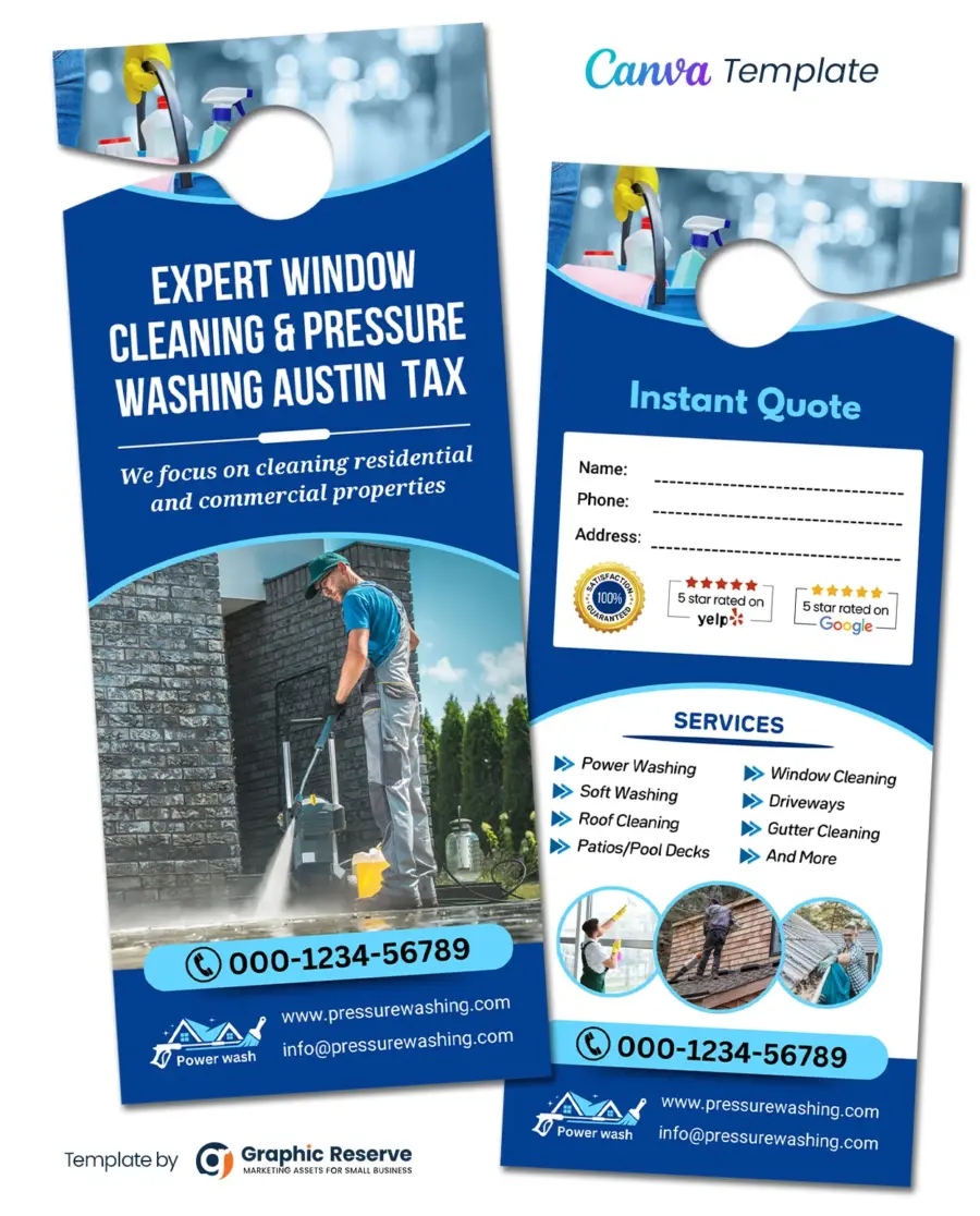 Pressure Washing Door Hanger Design Template design for door-to-door marketing. This door hanger is an online editable Canva format, which is customizable by any person.