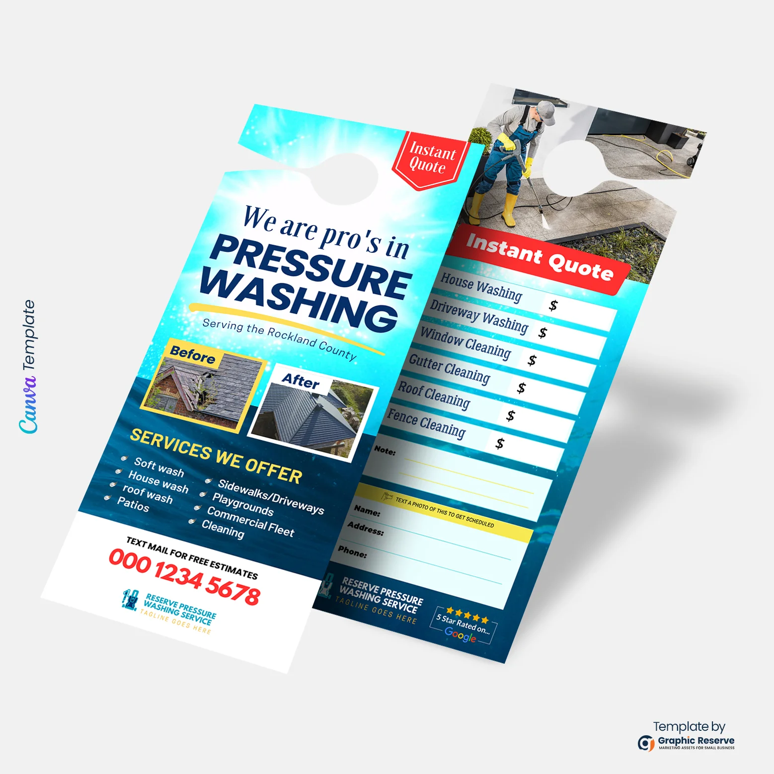 Make quoting easy with this instant quote door hanger built specifically for pressure washing services. Whether you need a simple design or a full pressure washing instant quote door hanger template, this Canva file gives you the flexibility to create a high-impact marketing piece in minutes.