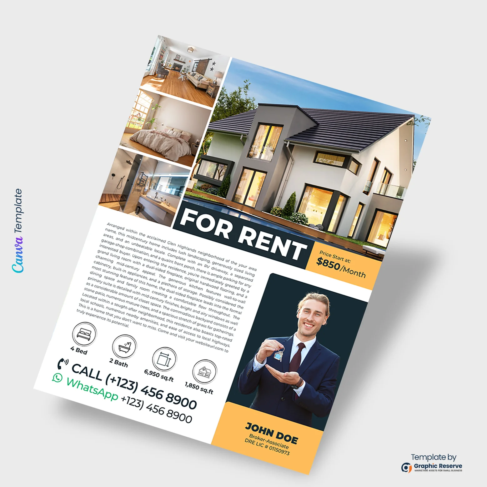 Real Estate For Rent Canva Flyer Design Template The real estate flyer template is a great tool for promoting your real estate business also useful for a realtor or a real estate agent. You can use it for real estate listings or sold, advertising homes or property for sale, or renting houses. Create a stunning leaflet on the fly and streamline your workflow with this easy-to-edit template. Fully editable, image/logo can be quickly added or replaced in Canva