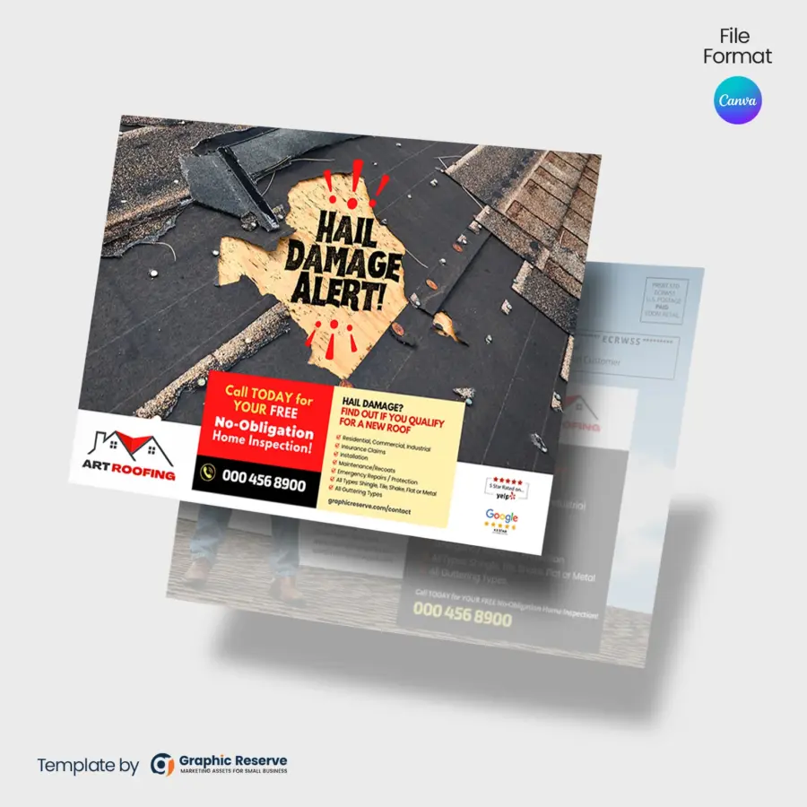Roofing direct mail marketing eddm postcard design template for storm/hail damage alert. Online editable canva file format.
