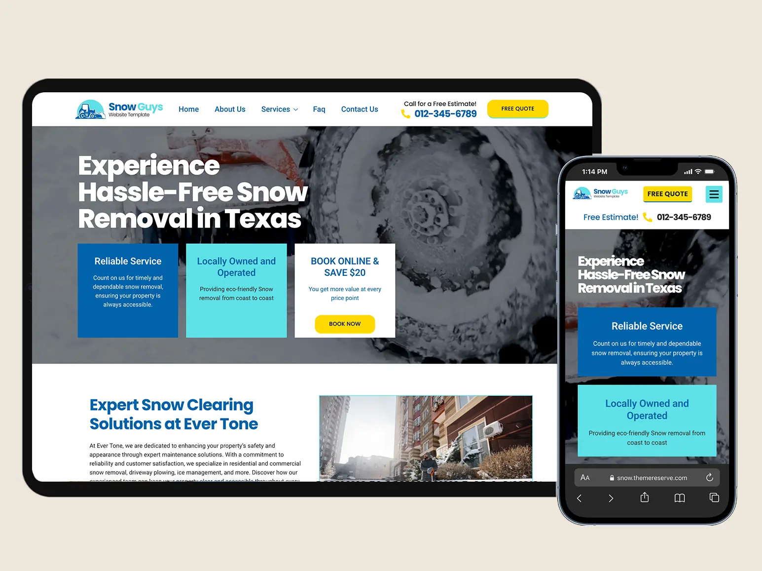 Snow removal website template: SEO-friendly, online booking, and fast-loading. Its mobile-friendly design ensures it looks great on all devices for a smooth user experience.