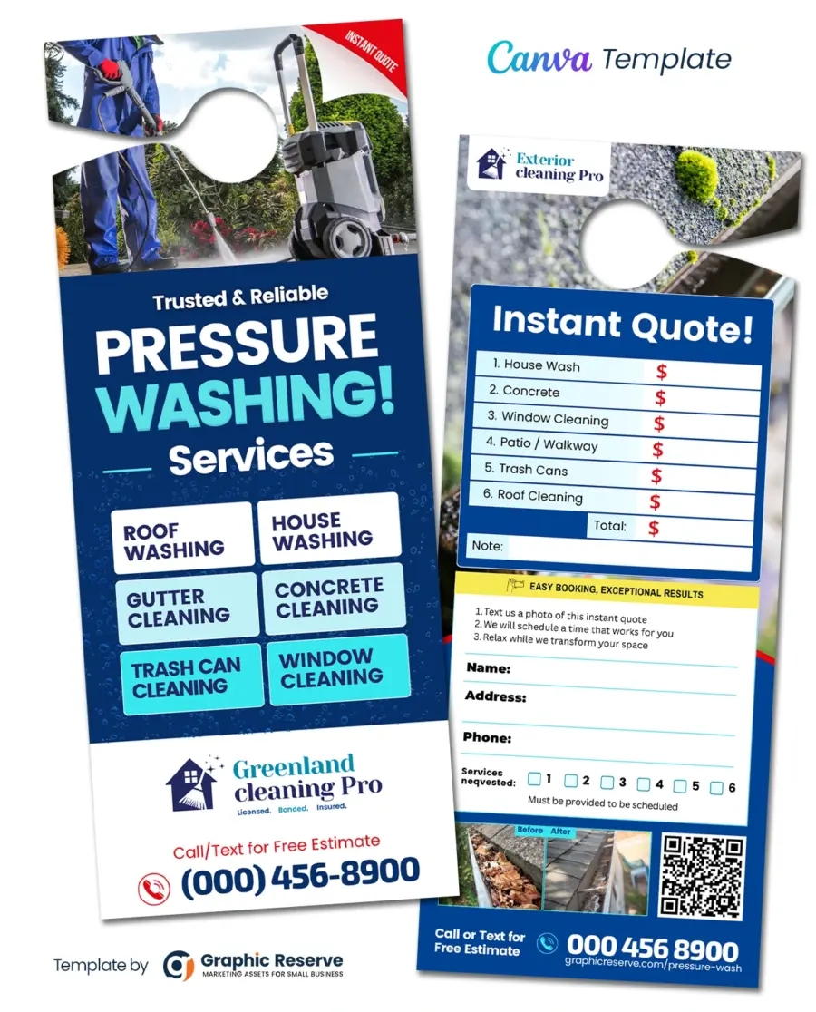 Get noticed with a professional instant quote door hanger template designed for pressure washing companies. This Canva template provides space for your logo, contact information, and a clear call-to-action so customers can request a pressure washing service instant quote in seconds.